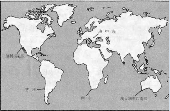 这些就是新月沃地的植物群向最早的农民提供的一些有利条件:它包括适于驯化的数量多得出奇的野生植物然而,新月沃地的地中海气候带向西延伸,经过南欧和西北非的广大地区。世界上还有4个类似地中海气候带的地区:加利福尼亚、智利、澳大利亚西南部和南非(图8.2)。然而,这些另外的地中海气候带不但无法赶上新月沃地而成为早期的出现粮食生产的地方;它们也根本没有产生过本地的农业。欧亚大陆西部的这种特有的地中海气候带究竟具有什么样的有利条件呢?