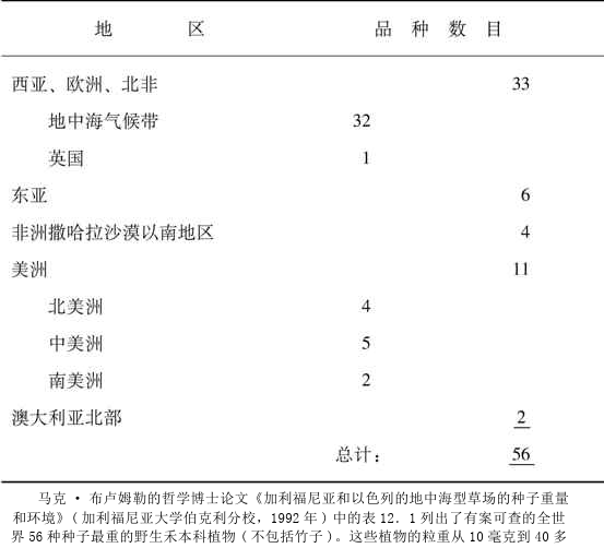 马克·布卢姆勒的哲学博士论文《加利福尼亚和以色列的地中海型草场的种子重量和环境》(加利福尼亚大学伯克利分校,1992年)中的表12.1列出了有案可查的全世界56种种子最重的野生禾本科植物(不包括竹子)。这些植物的粒重从10毫克到40多毫克不等,比世界上所有禾本科植物的中值大10倍左右。这56种禾本科植物占全世界禾本科植物不到百分之一。本表表明,这些最有价值的禾本科植物以压倒优势集中在欧亚大陆西部的地中海气候带。