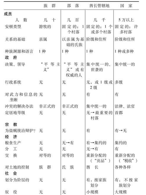 国家的所有这些特征,把从部落到酋长管辖地的发展引向了极端。不过,除此以外,国家还是从酋长管辖地沿几个不同方向演化的结果。这方面最根本的差别是,国家是按政治和领土而组建起来,不是按照划分族群、部落和简单的酋长管辖地的亲属关系而组建起来的。而且,族群和部落始终是由单一的族群和语族组成的,酋长管辖地通常也是如此。然而,国家——尤其是通过对一些国家的合并或征服而形成的帝国——通常都是包括不同种族和使用多种语言的。在后期的国家中,包括今天大多数国家在内,领导常常变成非世袭的,而且许多国家放弃了酋长管辖地遗留下来的关于正式世袭阶级的整个制度。
