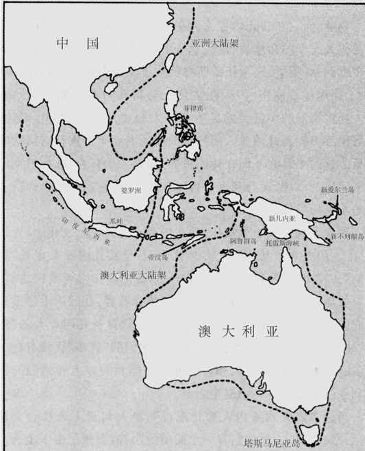 图15.1 从东南亚到澳大利亚和新几内亚的地区图。实线表示现今海岸线;虚线为更新世时期的海岸线,那时的海平面比现在的低——就是说,当时的海岸线就是亚洲大陆架和澳大利亚大陆架的边缘。当时,新几内亚和澳大利亚连在一起,成为一个扩大了的大澳大利亚,而婆罗洲、爪哇、苏门答腊和台湾还是亚洲大陆的一部分。