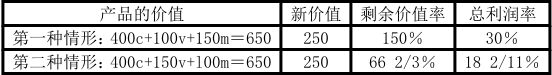 首先,剩余价值比以前减少三分之一,由150减为100。利润率下降略多于三分之一,由30%下降到18%,因为已经减少的剩余价值要按已经增加的全部预付资本来计算。但它并不和剩余价值率按相同的比例下降。剩余价值率由150/100下降到100/150,即由150%下降到66 2/3%,而利润率只由150/500下降到100/550,即由30%下降到18 2/11%。因此,利润率按比例来说比剩余价值量下降得多,但比剩余价值率下降得少。其次,我们看到,如果使用的劳动量和以前相同,尽管预付资本由于它的可变部分的增加而增大,产品的价值和总量却仍旧不变。预付资本的这种增大,对一个开始新营业的资本家来说,确实是件令人不安的事情。但是,从整个再生产来看,可变资本的增加只不过表示,在由新加入的劳动新创造的价值中,要有一个较大的部分转化为工资,因而要首先转化为可变资本,而不是转化为剩余价值和剩余产品。因此,产品的价值仍旧不变,因为它一方面受不变资本价值400的限制,另一方面受一个体现新加入的劳动的数字250的限制。这二者都没有改变。这个产品,只要它本身再加入不变资本,就会和以前一样,在同一价值量中,代表同样大的使用价值量;因此,同一数量的不变资本要素保持着相同的价值。如果工资提高不是因为工人得到自己劳动的一个较大的部分,而是相反,工人得到自已劳动的一个较大的部分,是因为劳动生产率已经降低,那末,情况就会不同。这时,体现同一劳动即有酬劳动加上无酬劳动的总价值仍旧不变;但体现这个劳动量的产品量将会减少,因而产品的每个相应部分的价格就会提高,因为每个部分代表了更多的劳动。已经提高的工资150不会比以前的工资100代表更多的产品;已经减少的剩余价值100,和以前相比,也只代表以前100所代表的产品或使用价值量的2/3,或66 2/3%。在这种情况下,如果这个产品加入不变资本,不变资本就会变贵。但这不是工资提高的结果,相反,工资提高是商品变贵的结果,是同量劳动的生产率降低的结果。这里产生一种假象,似乎工资提高使得产品变贵;但实际上,工资的提高,并不是商品价值变化的原因,而是这种变化的结果,而商品价值的变化是由于劳动生产率的降低所引起的。