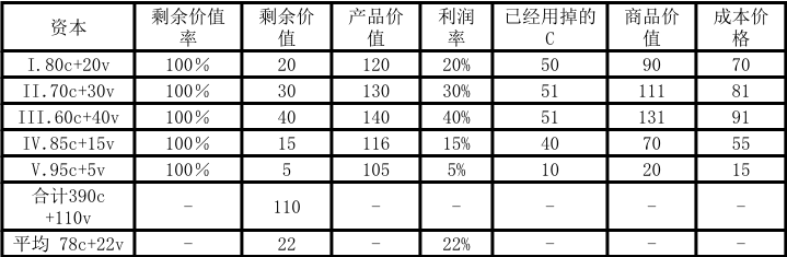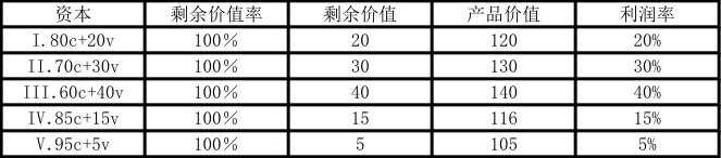 在资本有机构成=80c+20v,剩余价值率=100%时,如果全部不变资本都加入年产品,资本I=100所生产的商品的总价值就=80c+20v+20m=120。在一定条件下,这个结果可以在一定生产部门内发生。但并不是在所有c和v的比率=4:1的地方,都有这样的结果。因此,在谈到不同资本每100所生产的商品的价值时,必须考虑到,商品价值会由于c的固定组成部分和流动组成部分之间的比率不同而不同,并且不同资本的固定组成部分又会快慢不等地损耗,从而在相同的时间内把不等的价值量加入产品。不过,这对利润率来说没有什么关系。不论80c是把价值80,50,或5转移到年产品中去,从而也不论年产品是=80c+20v+20m=120,还是=50c+20v+20m=90,或者=5c+20v+20m=45,在所有这些场合,产品的价值超过它的成本价格的余额,都等于20;并且在所有这些场合,在确定利润率时,这20都按资本100计算;因此,在所有这些场合,资本I的利润率都=20%。为了把这一点说得更清楚些,我们在为上述五个资本编制的下表中,假定不变资本各以不同的部分加入产品的价值。