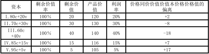 假定社会平均资本的构成是80c+20v,年剩余价值率m'=100%。这样,一个100的资本的年平均利润就=20,一般的年利润率就=20%。不管一个100的资本一年内生产的商品的成本价格k如何。它的生产价格总是=k+20。在资本构成=(80-x)c+(20+x)v的生产部门,实际生产的剩余价值或在这个部门内生产的年利润=20+x,比20大,所生产的商品价值=k+20+x,也比k+20大,也就是说,比它的生产价格大。在资本构成是(80+x)c+(20-x)v的部门,每年生产的剩余价值或利润=20-x,比20小,因此,商品价值k+20-x,也比生产价格k+20小。撇开周转时间上可能发生的差别不说,只有在资本构成偶然=80c+20v的部门,商品的生产价格才等于商品的价值。