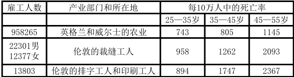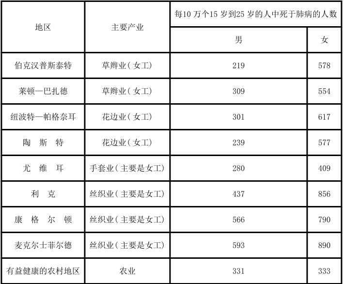 1860年和1861年卫生局调查了在室内经营的产业部门,这些部门的死亡统计表明:就同等数量的15岁到55岁的男子来说,如果在英国农业地区因肺结核和其他肺病引起的死亡数为100,在以下几个地方的死亡数是:考文垂死于肺结核的为163,布莱克本和斯基普顿167,康格尔顿和布莱得弗德168,莱斯特171,利克182,麦克尔士菲尔德184,波尔顿190,诺定昂192,罗契得尔193,得比198,索尔福和埃士顿—安得—莱因203,里子218,普雷期顿220,曼彻斯特263。(第24页)下表提供了一个更明显的例子。这个表按性别分别列出每10万个15岁到25岁的人中死于肺病的人数。表上所列举的地区,只有妇女在室内经营的产业中工作,而男子却在各种劳动部门工作。