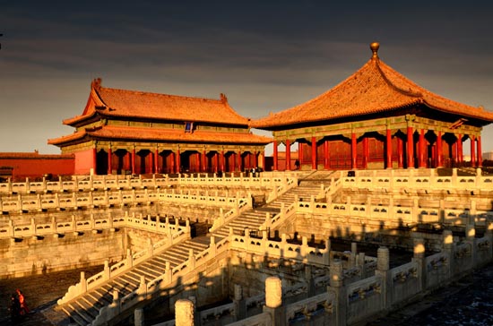 宫殿建筑的另一特点是采取前朝后寝的布局形式。在皇宫的前半部分,是帝王处理政务或举行大典的殿堂,称前朝;皇宫的后半部分是帝王与后妃生活起居的场所,称后寝。整个皇宫的主要建筑都位于中轴线上。如故宫前朝的太和殿、中和殿、保和殿,后寝的乾清宫、交泰殿和坤宁宫,都分布在中轴线上,两边对称分布的则是次要建筑。这种严格的中轴对称布局格式,更能突出帝王的威严和至尊。我国目前保存较完好齐全的主要有北京故宫和沈阳故宫。