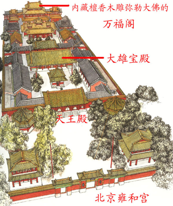 木建筑的喇嘛寺仍旧采用了四合院式布局,寺庙前半部的山门、天王殿、大殿,都和佛寺差不多。但大殿以后的部分常有高大而雄伟的建筑,在布局上也有所变化;例如雍和宫的后部采用三殿并列的制度,用复道将高大的万福阁和两侧的永康阁、延宁阁连接起来,气势十分壮丽。