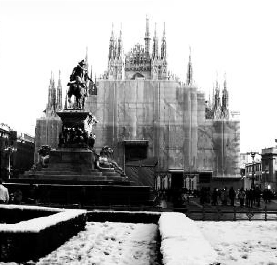 我们首先到杜莫广场,天真的孩子们在广场南部一个圈起来的滑冰场追逐,阳光照在莹白的雪上,映着他们灿烂的笑脸。广场北部是号称世界第二的米兰大教堂。进门要排队,就在我们队伍旁边,一群防暴警察头戴钢盔,手持盾牌和警械与一群中东人对峙。双方一进一退斗争了好几个回合,而后又各守自己的阵地。我们的队伍慢慢地从他们身边移动过去……