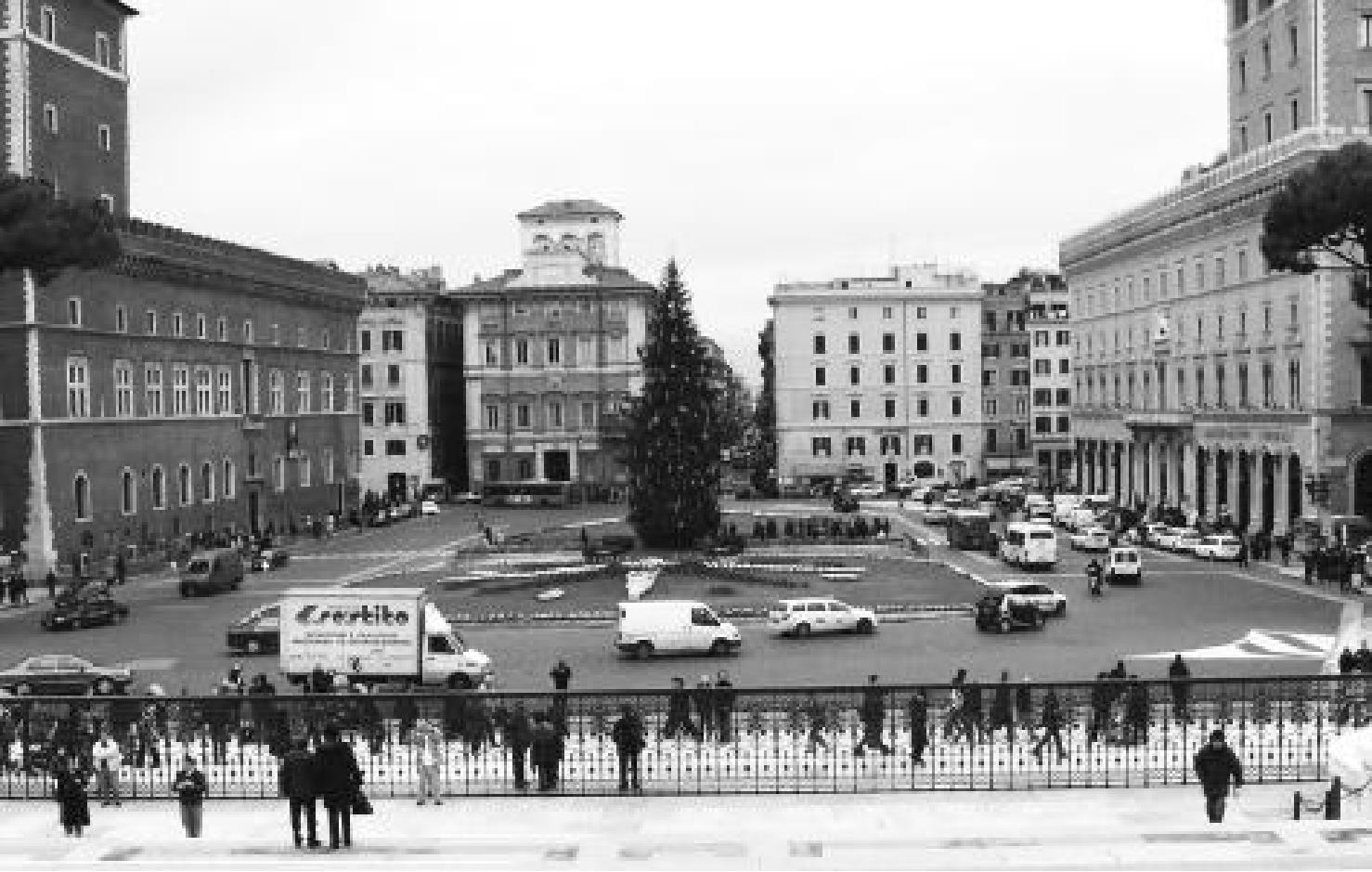 离开斗兽场,乘公共汽车到威尼斯广场(Piazza Venezia)。广场不大,但其“祖国之父祭坛”很壮观。衣着中古服装的仪仗兵持枪守卫着无名烈士墓的圣火,神圣肃穆。我们一口气跑上祭坛顶层已是气喘吁吁。祭坛周围雕刻非常精细,白色大理石建筑使对罗马的灰色印象为之一变。这一组建筑已成为意大利统一纪念馆,免费开放。站在坛顶俯瞰广场对面墨索里尼曾经的官邸威尼斯宫,很不起眼。一幢十分朴素的水泥建筑,像工人的宿舍,但在历史上它却显赫一时。法西斯在这里面密谋了很多糟蹋世界的坏主意。