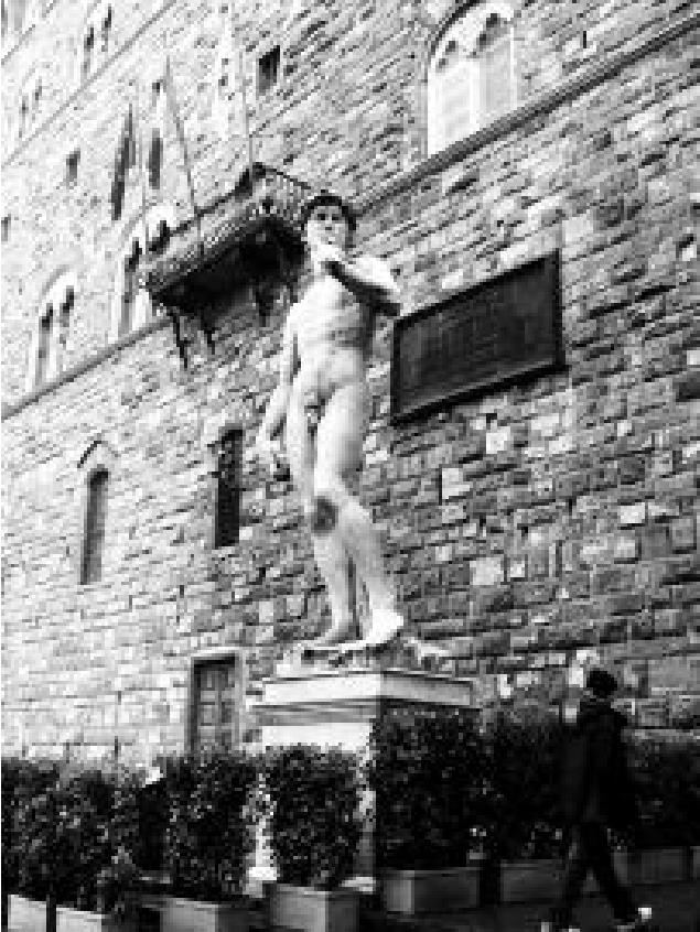第二天清早,我们便进城游览。第一个景点是米开朗琪罗广场。在阿尔诺河另一边的半山腰,可俯视全城。16世纪时,这座城是世界上经济最发达、文化最先进、思想最解放的地方。广场上有米开朗琪罗“大卫像”的青铜复制品。大卫,一个赤身裸体的青年,手执发射器准备上战场的战士,几百年来让世人敬仰、赞美。
