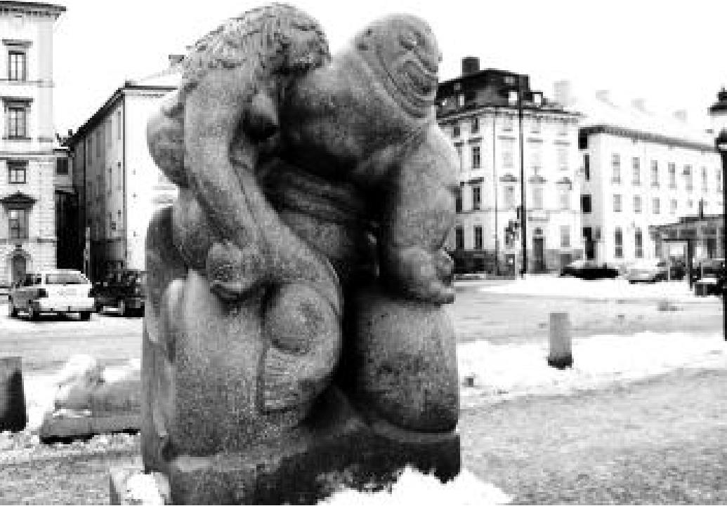 斯德哥尔摩的港湾很有特色,被城市包围着,或者说它把城市包围着。你站在港口的这边,目光漂过茫茫水域,可以看到对岸繁华的古城及古城堡的雄姿。到港口那边岸上,回首这边,也一样教堂林立,大楼傲然。港湾停着不少有桅杆的古船,水道深入到城市中心。整个斯德哥尔摩是由14个岛屿和一个半岛组成的,号称又一个“北方威尼斯”。夏天来这里,相信碧海蓝天红房绿岛,行船荡漾其中,不是梦中也是梦,真是景不迷人人自迷。沿着海港走走,也能感受到一种异质文化。一个三四尺高的雕塑立在岸边,有点像中国江河岸边的石敢当,是两个怪怪的拥抱在一起的图形,不知道是什么,就叫它海公海母吧。