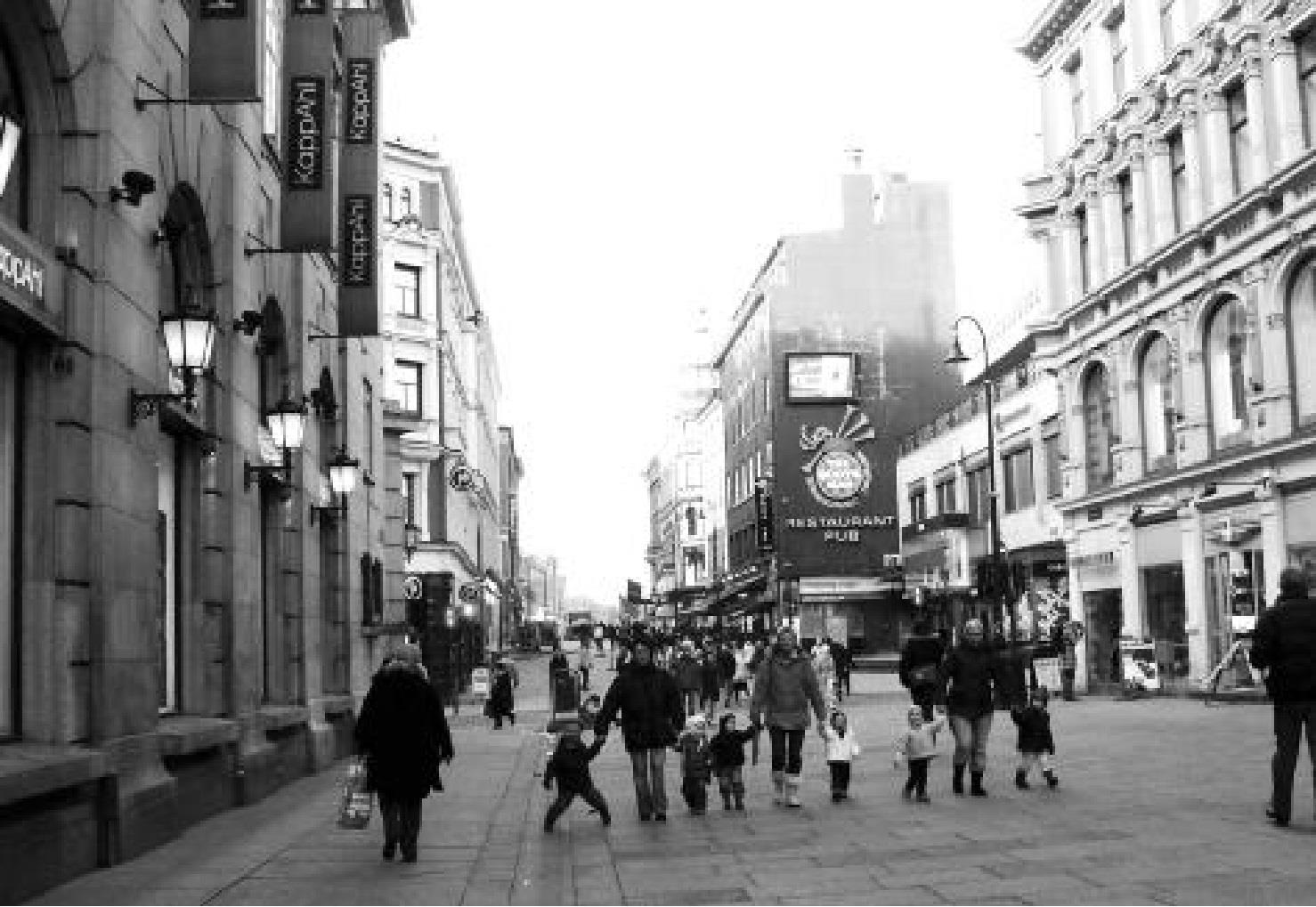 按照两位店小二的建议,我们决定从奥斯陆最繁华、最具代表性的大街看起。经过休整,大家精神倍增,走到街上迎着初升的太阳,看着蓝天白云,顿觉荡气回肠,空气中已感到春意萌动。大街面貌也一扫昨晚的昏暗,显得很有朝气。有轨电车哐当哐当开过,载着一车欢愉的生活。来到所谓最具代表性的繁华街口一看,正是昨晚我们分头出击又集合的十字街口。正对火车站的这一条街,大概就是奥斯陆的“十里洋场”。街道不宽,很古老,还有教堂,街面很整齐,行人比较适中。挪威人男男女女都很高大,尤其年轻妇女身材特别有型、健美,行走快速,显得精力充沛,小孩子们更活泼可爱。在街尾有运动场、滑冰场,一早老师像赶着一群小鸭子,带着幼儿园、小学低年级的孩子来了。一到滑冰场,孩子们就往积雪上一坐,有的换冰鞋,有的脱衣服,有的还忙着喝冷牛奶,啃硬面包。当他们一下到滑冰池,就飞也似的转起来。他们看到我们的照相机就滑过来对着镜头笑着做怪样子。“简直就是一群‘小海盗’”,我忍不住跟他们逗乐。不可否认,这是一个健康的、有活力的民族。当然,在街头繁华的地方,也有乞丐在讨钱,样子似乎不是挪威人。