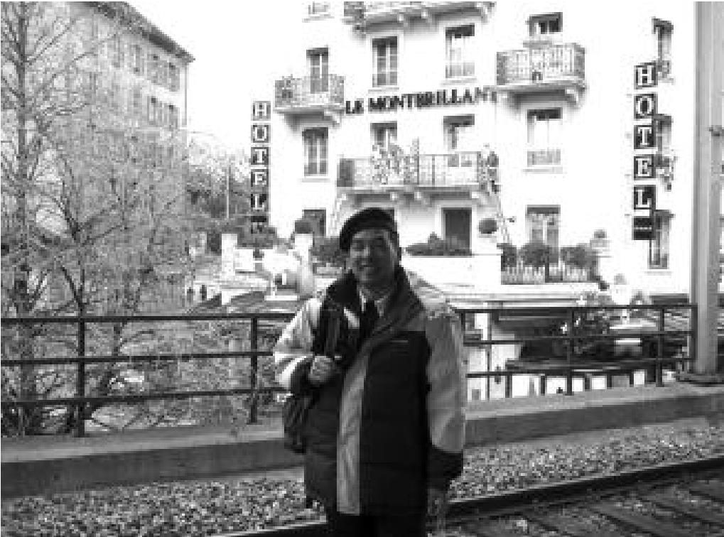 轮到我们过边防,法国这边的警察看看护照就挥手让我们过去了,算是出国了。经10米远的中间地带,到瑞士入关处,小雨走在前头,边防人员看了看护照,挥挥手让他过去,有另一边防人员将他带到瑞士境内一个小房子里。我们在后面看着,还以为他顺利过关了,正高兴。轮到我们时,才发现小雨的护照被留在桌面上。我们也一样,被留下护照到小屋待着。一会儿,来了个边防官员,对我们宣布:“瑞士不是申根协议国家,不能接受你们的入境。”我们说该怎么办,回答是只有离境返回法国。我们说没有火车回法国了,他们说他们不管。我们说只进城去转转,他们说不行。这时解释也好,装傻也罢,都没有用。估计已没有商量的余地,那么就按毛主席说的:“打得赢就打,打不赢就走。”只有撤退。在返回法国境内前,我们在通道里隔着大玻璃墙以瑞士街景为背景拍了张照片,算是在瑞士的留影吧。背景是一个旅馆,红衣圣诞老人正背着个口袋从屋檐爬下去。我们谑称,圣诞老人完全可以不用护照嘛,但他老人家似乎不喜欢走正道。以前乐意走烟囱,现在没烟囱就从屋檐下的窗户而入。