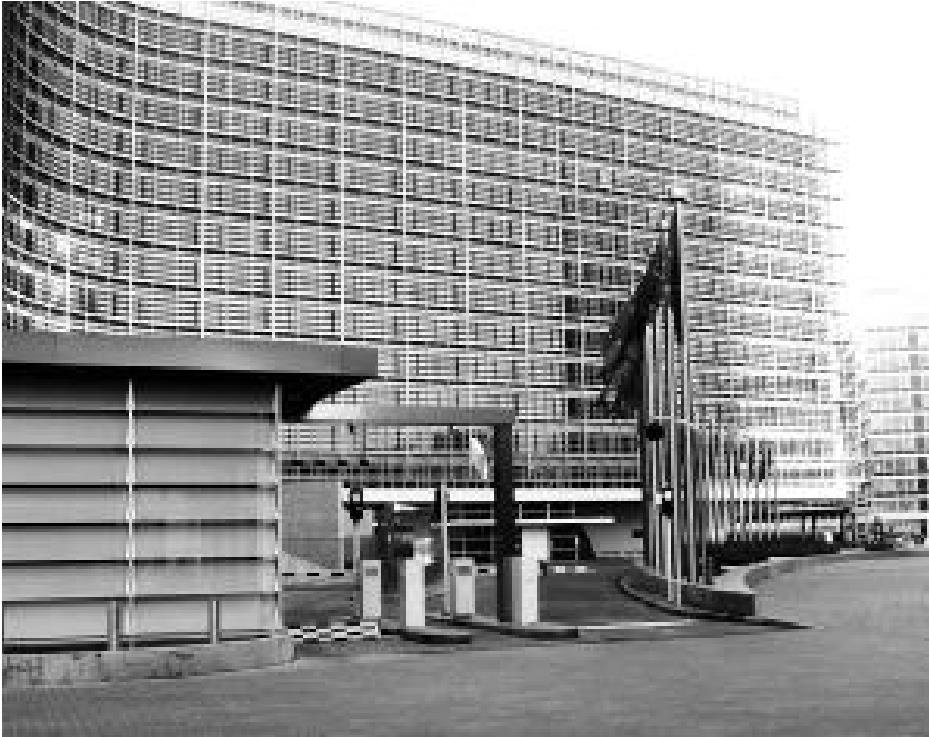 欧盟委员会总部可乘地铁去。地铁用火车的“欧洲通票”就可以。这里像奥地利、德国一样,进地铁无验票,也无栅栏之类。在欧盟总部钻出来,是在地势较高的十字路口。向北是解放纪念广场,向南下坡几分钟,右手边就是欧盟委员会总部的侧面。一幢非常高大的现代风格大楼,很气派。我们转到它的正面,一个不大的广场,有一尊约3米高的雕塑,再就是一排高高的旗杆,上面飘扬着欧盟各国的国旗。欧盟总部很气派,但一点也不威严。没有武装把守,也没有保安巡逻。我们进去,守门的人连问也不问,偶尔几个工作人员匆匆进出。我们坐在旗杆台阶上,晒着太阳不经意地聊天,就像在大学校园食堂门口。