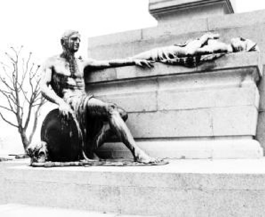 过了阿道夫大桥向右,是一个公园(宪法广场Palace de la Constitution)。公园像个大大的舞台,一面临着大峡谷,有悬空感。卢森堡人自称,这里是欧洲最美的阳台。公园里有一座高高的烈士纪念碑。碑顶是一个金色胜利女神像,在夕阳照耀下闪闪发光。碑的底部前一组雕像别具意境:战死的烈士静静躺着,双手还握着置放在胸膛的剑,幸存的战友则坐在烈士身旁,一手搁在烈士躺的平台上,一手扶着圆盾,作沉思状。两次世界大战卢森堡都摊上了,深刻的打击,就像这大峡谷刻在这城市躯体上,印在人们的心中,久久不能忘怀。