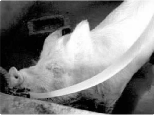 对比两次报道可以看出来,现在的灌注者更加不顾动物的死活,“营利”的方式更加野蛮。1996年给猪灌注的是米糠、鸡屎、沙子等混合物,还貌似饲料,到2001年,灌注者直接往猪体内灌注污水废渣;1996年是由人捉住每一头猪来灌注,而到了2001年,某些灌注者直接用大铁钩子钩住活猪的下巴。人们已经不需要对活的动物有任何考虑了,而径直待之以血腥。应该说,社会的漠视和道德上的迟钝助长了这种广泛发生的恶行。对于无助的动物,我们不仅关切太少,而且没有道义上的亏欠。