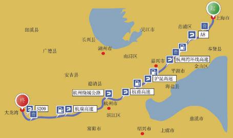 上海市—A8—杭州湾环线高速—沪昆高速—杭甬高速—杭州绕城公路—杭瑞高速—S209—大龙湾