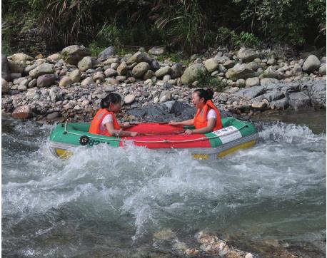龙井峡漂流并不在大龙湾景区内,而是和大龙湾相距4公里,不过它的源头就在大龙湾。龙井峡的水流并不是很急,所以小朋友也可以玩,不需要担心安全问题。虽然漂流的路程大部分比较平缓,不过也有六七处较高的坎,皮艇从坎上冲下来在周围的岩石上左碰右撞,会让人觉得很刺激。漂流全程需要40多分钟,漂流之前最好预先另外准备一套衣服,否则拖着湿湿的身体会非常狼狈。