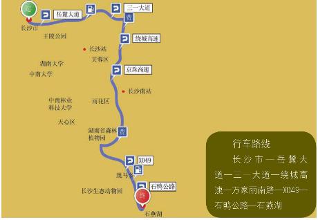 从长沙市政府出发,经过岳麓大道和三一大道后,直行入长永高速,朝湘潭/珠海/G4方向,上绕城高速/京珠高速,沿路行驶约15.5公里,右转入G0401,直行进入绕城高速,接着行驶约2公里从万家丽路出口离开左转,前行约360米左转入万家丽南路,继续行驶约1公里左转入环保东路即X049,再行驶约7公里经过跳马派出所后,稍向右转入石鸭公路,沿路行驶约2.5公里便到石燕湖。