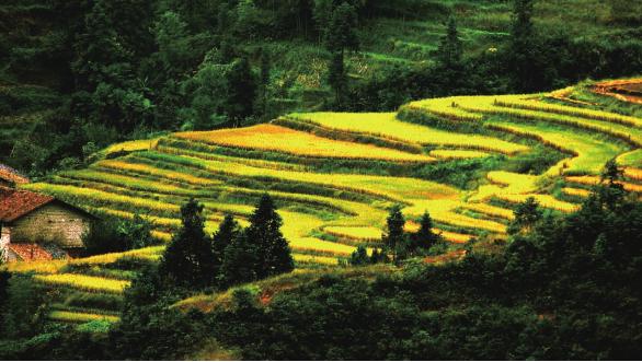 从海拔约1 100米的田心村开始登山,一行人一边爬山一边赏景,一起休息拍照,相互打气登上山顶,看重山叠翠,奇花异草。登山途中还有牛群为伴,爬到半山腰你就会看见那棵著名的迎客松。在登山途中,最不可错过的美景便是那层层叠叠的稻田。你站在山腰远远望去,像是黄金铸成的层层阶梯通向山巅,与山上已经开始变黄的叶子相互辉映,一片金黄灿灿,好不恢宏大气。相信这时候用不着任何人提醒,你也已经忍不住一边惊叹一边举起相机了。