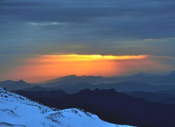 时间一分一秒地过去,天空似乎有点儿亮了,开始微微露出橙黄色,并不断扩大、变浓。随后,太阳从云海深处升起来了,先是探出前额,再是半个脸庞……太阳发出夺目的光芒,缓缓地向上移动,周围的云彩也披上了金边,彩霞满天,好似身着黄装的曼妙女子,正翩然起舞。此时的云海,也镀上了金色的光辉,恍若梦境。再看那远处的山峦,金光灿灿,积雪在阳光的照耀下非常光亮,这就是日照金山的壮美景致!能有幸目睹这天地之大美,心情豁然开朗……