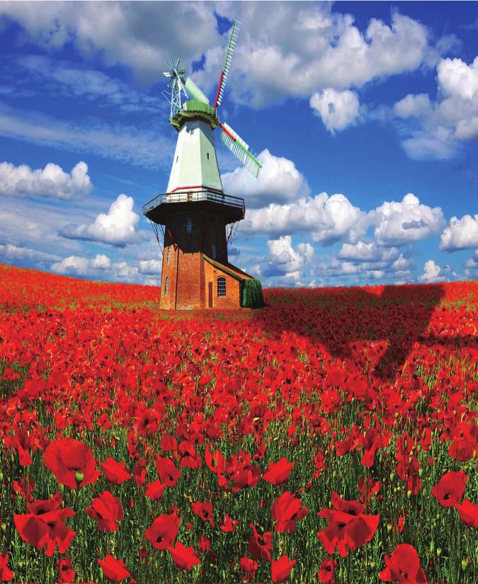 在蓝天白云的映衬下,红罂粟更显艳丽,转动的风车让平静的画面新增了几丝活力。