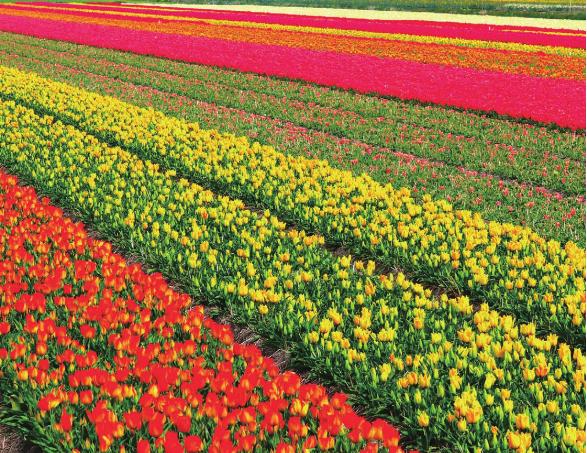 五彩缤纷的郁金香好像一条条彩带,向天边无尽延伸。
