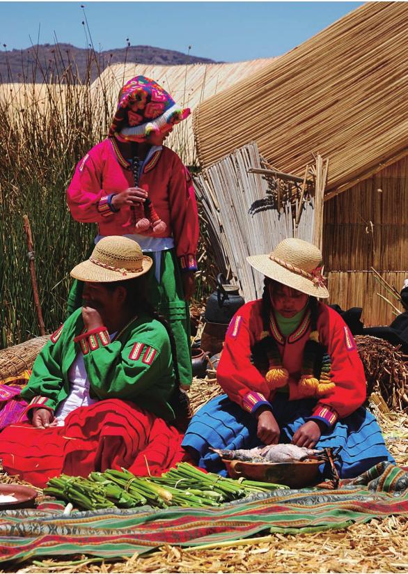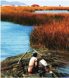 当地的乌鲁斯人以湖为生,以芦为生。的的喀喀湖的又一胜景便是湖中一座又一座的“浮岛”,勤劳朴实的乌鲁斯人在“浮岛”上安居乐业,幸福生活。炊烟起,又是秋风为伴,在湖的上空弥漫,在湖水中弥漫,不知谁上谁下,天地一体。“浮岛”是由芦苇编成,乌鲁斯人编制芦苇的技术堪称一绝。他们的装饰品,他们的穿戴,他们的捕鱼船都是由芦苇编制而成。据说12吨的芦苇,8小时后就会编成一艘船。