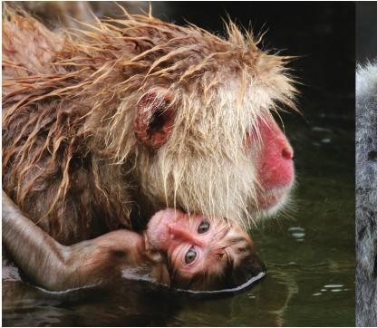 到了冬季,日本雪猴便会成群结队地前往温泉池,扑通扑通跳下水,溅起朵朵水花。整个温泉池霎时间变成猴的王国。它们有的在池中四处游走,浮力使得它们两腿站立,仿若在池中漫步。有的慵懒地攀附在岩壁上,下半身浸泡在泉中,长长的皮毛顺着水波荡漾开来。肩上、头顶等裸露在外的部位积上了厚厚白雪,雪猴惬意地合上双眼,一动不动,似乎宁愿被雪掩埋也不愿离开。有的霸占着池中,将全身浸泡入水中,只露出个小小的脑袋,脸被氤氲的热气蒸得红通通的,仿佛擦了胭脂一般,很是可爱。有的则调皮地隔一会儿便潜到水底觅食,找到吃的还爱干净地在水中洗洗再放进嘴里。有的小猴被它们的母亲怜爱地抱在怀中,一遍遍地清理毛发……