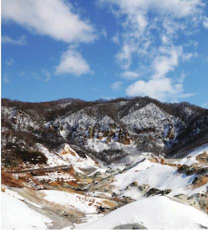 地狱谷一年中有四个月都被白雪覆盖,冬季平均气温在零下10 ℃以下。雪花给整个山谷罩上了一件银白的轻纱,在林间小道穿行,树枝承受不住积雪的重量,扑簌簌地掉落下来。晴天时冬日的暖阳将金色的光辉洒向山林,山谷间便升腾起了片片氤氲的雾气,那是地狱谷的温泉。