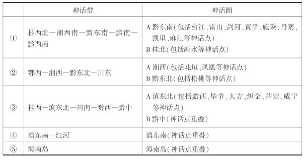 关于苗族的神话,有中国国内的研究者进行考察并积累了一定业绩。特别是过竹所作的成体系研究,对神话从创世神话、射日神话、洪水神话、族源神话、迁徙神话等多方面进行了严谨的检讨,其以贵州省的苗族居住地为中心,分成五个系统的“神话带”,其中设定了包含共同要素的神话圈,进一步还尝试考察了各地存在的神话点(过竹,1988:2-3)。如下所示,还考虑到与方言集团的关系,①是中部集团(自称Hmub模),②是东部集团(自称Ghao Xong,Qo Xiong果雄),③④是西部集团(自称Hmong蒙。一部分称“阿髦”),⑤是海南岛的苗族。广西百色迁移过来的瑶族属于另外的系统(表1)。作为大体的框架这样的分类没有什么问题。