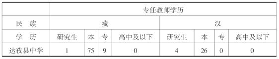 在他民族一贯看法中,都认为少数民族地区的师资学历偏低,这应该是普遍事实,但对于少数民族地区的一些较发达地区,通过政策的重视和扶持、教师的再教育等各种途径,其专任教师的学历并不比内地的一些农村县中学低,也许还略高。从表3的调查数据显示,该中学的专任教师学历都是达标的,汉族教师的学历还较高,全校现有5名研究生学历的高水平教师。但学历并不代表师资质量,访谈中得知,虽然藏族教师的学历都基本达标,但是因为藏区升学门槛较低,所以其普遍基础仍较差,师资质量难以保证。