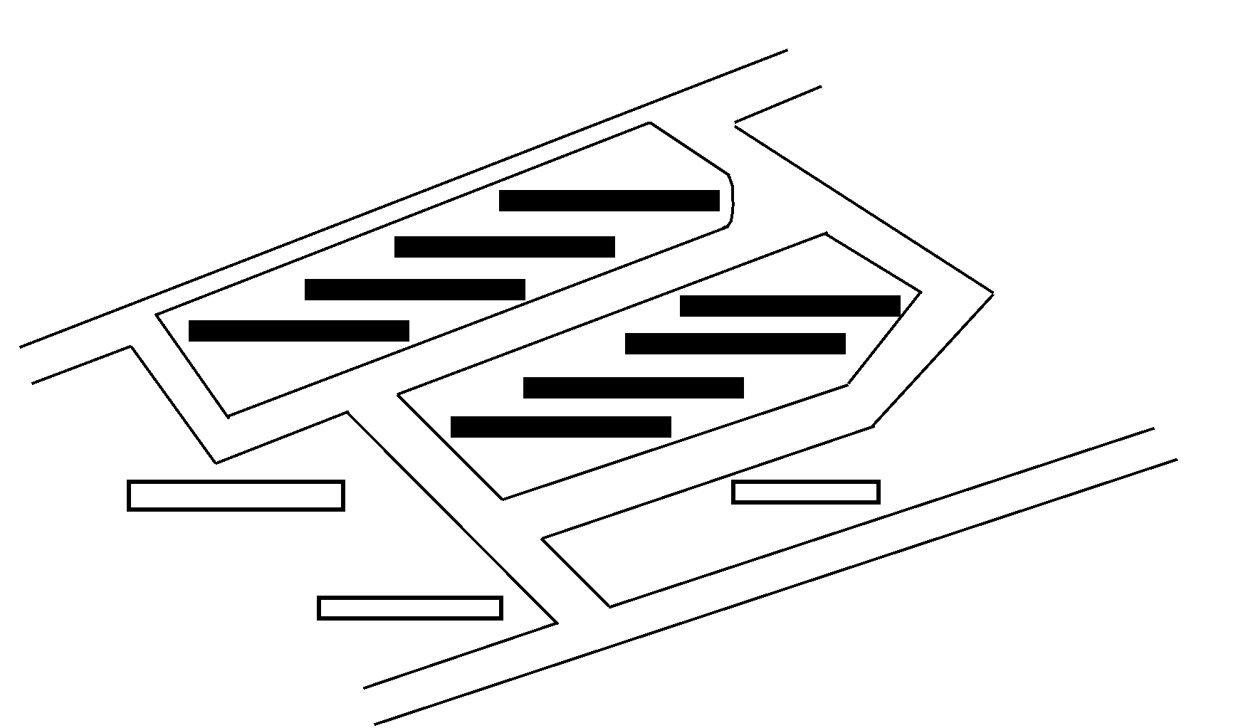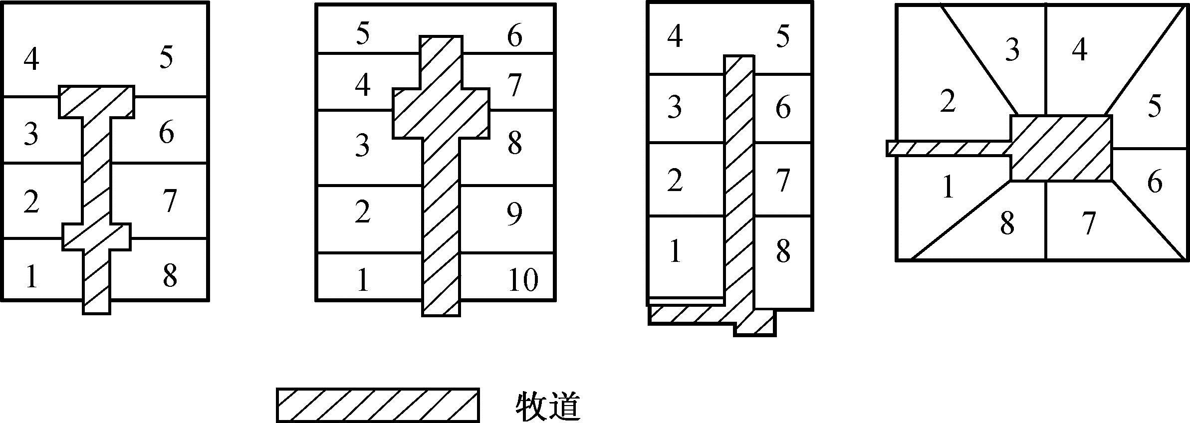 ① 条式组群。这是住宅群体的基本组合形式,根据当地良好的朝向和合理的间距依次排列各幢住宅,其特点是各排住宅等距离排列,各排横列对齐。能满足各幢住宅的日照要求,对工程管网和道路布置较为有利,在平面上和空间上均有一定的韵律感、节奏感。为了克服一定的单调性,应当结合道路、朝向、风向等因素作适当变化,从而形成各种形式的条式组群(见图5.1)。