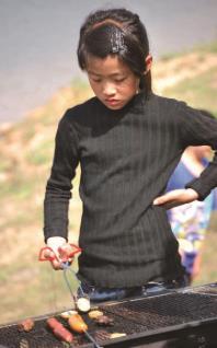 一切准备就绪,就可以开始了,将烧烤炉放在较平整的地方,风门应在上风口。点燃木炭并非易事,可以将木炭堆成堆,加一些助燃剂,炭自身燃烧后再摊开。铺炭的时候要铺满铺匀,才能保证火力均匀。烧烤时要注意不要站在下风口,一来烟大,二来飞出的火星很容易烫伤人。不然烧烤还没有吃着,就成了一个“包公”了。“嗞嗞”声中,只见烤烧烤的人学着非常专业的样子,一会儿翻动着食物,一会儿洒着各种调料,乐此不疲。而吃的人一边大口地享受,一边大呼“还是生的”“没有盐”,不论味道如何,却吃得不亦乐乎!