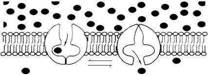 载体蛋白(简称载体)通常是贯穿脂质双分子层的跨膜蛋白,具有与被转运物质特异性结合的位点。它能在浓度高的一侧与被转运物质结合,这种结合可迅速引起载体蛋白的构象发生变化,使被转运物质朝向低浓度的一侧,并且与被转运物质分离(图2-2),完成跨膜转运,载体蛋白的构象恢复到原来状态。葡萄糖、氨基酸、核苷酸等物质从浓度高的一侧跨膜进入浓度低的一侧一般都是通过各自的载体进行的。