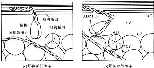当肌肉处于舒张状态时(图2-14(a)),细肌丝上的原肌凝蛋白遮盖了肌纤蛋白上的位点,使粗肌丝上的横桥无法与细肌丝上的肌纤蛋白结合。肌钙蛋白以一定间隔出现在原肌凝蛋白上,其上有与Ca2+结合的位点,当终末池内的Ca2+大量进入肌浆(兴奋-收缩耦联的结果)时,肌浆中的Ca2+浓度升高,Ca2+与肌钙蛋白结合,使肌钙蛋白构型改变,引起原肌凝蛋白的构型也发生改变,从而暴露出肌纤蛋白上的横桥结合位点,横桥与肌纤蛋白结合。此时横桥ATP酶激活,分解ATP释放能量,横桥头部发生摆动,牵拉细肌丝向M线方向滑行,肌小节缩短,骨骼肌细胞收缩(图2-14(b)、图2-14(c))。横桥发生摆动之后又会与肌纤蛋白解离,回到原来的位置。如果肌浆中的Ca2+浓度仍然很高,横桥可与细肌丝上下一个位点再结合、再解离,反复进行,使肌肉收缩。因终末池对Ca2+的回收作用使肌浆中Ca2+浓度降低时,肌钙蛋白与Ca2+分离,原肌凝蛋白复位并又盖住了肌纤蛋白上的结合位点,横桥停止扭动,与肌纤蛋白脱离,细肌丝被动回位,肌小节恢复到原来的长度,肌肉舒张。