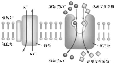钠泵活动形成的势能储备可“帮助”其他物质逆浓度的跨膜转运。例如,葡萄糖和氨基酸在小肠上皮细胞的吸收及在肾小管上皮细胞的重吸收过程等,这些物质逆浓度差转运所需要的能量不是直接来自于ATP,而是来自于钠泵活动形成的细胞内、外Na+的浓度势能,这种形式的转运是继发于钠泵的主动转运,故称为继发性主动转运(secondaryactive transport)(图2-5)。如果被转运物质与Na+扩散方向一致为同向转运;如二者方向相反为逆向转运。