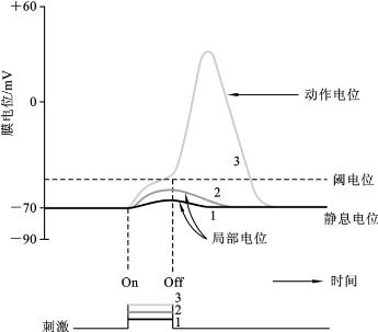 动作电位的产生是由于刺激使细胞膜上的Na+通道开放,Na+大量内流的结果。Na+通道属于电压门控通道,这种通道只有当刺激使细胞膜去极化达到某一临界值时才能被大量激活和开放,引起动作电位。这个能够引起细胞膜上Na+通道突然大量开放并触发动作电位的临界膜电位值称为阈电位(thresholdpotential)(图2-8、图2-9)。阈电位比静息电位高10~20mV,例如,神经纤维的静息电位是-70mV,其阈电位约为-55mV。静息电位去极化到阈电位是产生动作电位的必要条件,任何刺激只要能使细胞膜从静息电位去极化到阈电位,就能发生动作电位。单个阈下刺激之所以不能形成动作电位,正是因为不能使细胞膜的去极化达到阈电位水平。