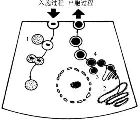 大分子物质或团块物质如蛋白质、核苷酸、多糖等不能直接穿过细胞膜,需要通过入胞和出胞的过程来完成跨膜转运(图2-6)。入胞和出胞涉及细胞膜的融合与断裂,需要消耗能量,属于主动转运。入胞是指细胞外的某些大分子物质或物质团块进入细胞的过程。如果进入的物质是固体,入胞称为吞噬;如果进入的物质是水溶性的(如蛋白质),将伴随一部分水进入,入胞称为吞饮。物质入胞时,先与细胞膜接触,引起该处的细胞膜发生内陷,通过细胞膜的融合和断裂,使物质连同包裹它的细胞膜一起移入细胞质中,形成吞噬囊泡或吞饮囊泡。