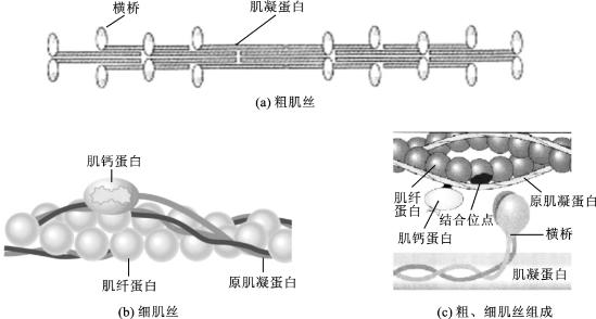 细肌丝由肌纤蛋白(肌动蛋白)、原肌凝蛋白(原肌球蛋白)和肌钙蛋白组成(图2-13 (b))。肌纤蛋白构成细肌丝的主干,其上有与横桥结合的位点。