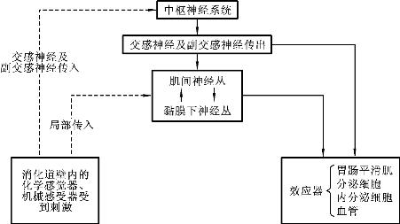 这是一组协调的反射,胃的反射性运动增强促进胃内容物排入十二指肠,而进入十二指肠的酸性食糜又启动肠-胃反射抑制胃排空,由此保证了胃内容物有序地排入十二指肠。随着十二指肠内容物中的盐酸被中和,消化产物被吸收,抑制胃运动的神经-体液因素逐渐减弱,促进胃运动的因素又占优势,使胃运动逐渐加强,又开始胃排空。如此反复,使胃排空能较好地适应十二指肠内消化和吸收的速度,直至食糜全部排入十二指肠。由此可见,胃排空速度能通过反馈作用而自动调节。通常一个蠕动波可使1~3mL食糜排入十二指肠,胃排空是间断的。