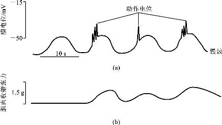 图6-1(a)所示的曲线为消化道平滑肌细胞内电极记录的基本电节律(慢波),在第2~4个慢波期间,出现数目不同的动作电位;图6-1(b)所示的曲线为肌肉收缩张力示意图,收缩波只出现在动作电位时,动作电位数目越多,收缩幅度也越大。