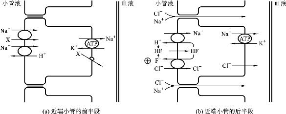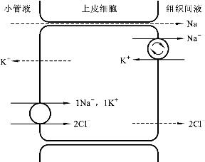 (1)近端小管:在近端小管的前半段,Na+通过Na+泵转运至细胞间隙,使细胞内低Na+并处于负电位,小管液中的Na+和葡萄糖与管腔膜上的同向转运体结合,Na+顺电化学梯度进入近端小管腔上皮细胞内,进入细胞内的Na+又被细胞基侧膜上的Na+泵泵至细胞间隙后扩散入血。另一部分Na+通过Na+-H+交换而主动重吸收,小管液中的Na+和上皮细胞内的H+与管腔膜上的交换体结合进行逆向转运,小管液中的Na+顺浓度梯度通过管腔膜进入细胞,进入细胞内的Na+也被Na+泵泵至细胞间隙而主动重吸收。Cl-的重吸收是被动的,由于Na+的重吸收使得近端小管腔负电荷较多而细胞内正电荷较多,细胞内对负电荷吸引力增加促使Cl-顺着电化学梯度进入细胞内,并随Na+一起进入细胞间隙后扩散入血。