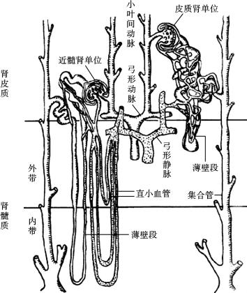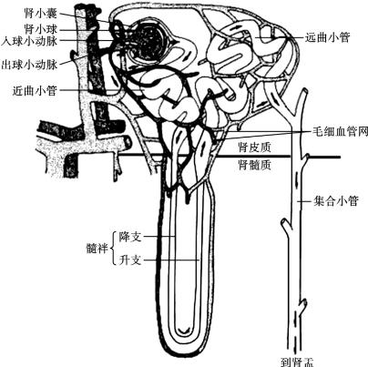 肾单位按其所在的部位不同,可分为皮质肾单位和近髓肾单位两类(图8-3)。这两类肾单位基本结构相似,其主要形态区别在于髓袢。皮质肾单位髓袢较短,细段更短,其附近毛细血管缠绕成网,此毛细血管和其功能(滤过)密切相关;近髓肾单位髓袢较长,细段也长,其周围毛细血管顺髓袢细段形成直小血管,直小血管与细段平行走行。近髓肾单位髓袢较长的特点,决定了近髓肾单位在尿的浓缩与稀释过程中起着主要作用。
