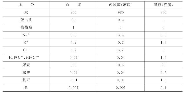 表8-1 血浆、超滤液、尿液成分对比 单位:g/L