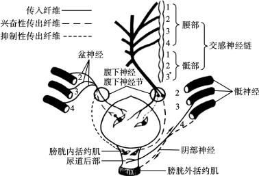 膀胱逼尿肌和尿道内括约肌受交感神经和副交感神经支配。由第二骶髓至第四骶髓发出的盆神经中含副交感神经,可使逼尿肌收缩、膀胱内括约肌松弛,促进排尿。腰髓发出的交感神经经腹下神经到达膀胱,其兴奋使逼尿肌松弛、膀胱内括约肌收缩,阻抑尿的排放。在排尿活动中,副交感神经的活动占主导地位。
