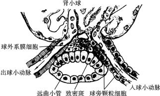 肾素的分泌受肾内因素和肾外因素的调节。肾小体血管有两种感受器,一是入球小动脉的牵张感受器,另一种是致密斑感受器。当动脉血压下降或循环血量减少时,激活入球小动脉牵张感受器,肾素分泌增加。同时,肾小球毛细血管血压下降和血流减少,肾小球滤过率低,远曲小管的小管液中Na+含量因而降低,可刺激致密斑感受器,导致肾素分泌量增加。肾外因素为神经性因素,近球小体颗粒细胞受交感神经的直接支配,当动脉血压下降或循环血量减少时,肾交感神经兴奋,刺激近球小体颗粒细胞分泌肾素增加。肾上腺素和去甲肾上腺素也有类似作用。