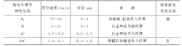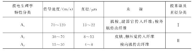 神经纤维可按传导速度的快慢分为A、B、C三类,还可根据神经纤维的来源与直径的粗细分为Ⅰ、Ⅱ、Ⅲ、Ⅳ四类(表10-1)。目前对传出纤维按电生理学特性分类,对传入纤维按来源及直径分类。