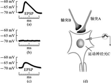 (1)兴奋性突触后电位:特征是突触后膜发生去极化。突触前膜释放兴奋性神经递质,当神经递质与受体结合后,提高了突触后膜对Na+和K+(尤其是Na+)的通透性。由于Na+扩散入细胞内,出现局部去极化,使突触后膜产生兴奋性突触后电位(excitatory postsynapticpotential,EPSP)。兴奋性突触后电位可以总和起来,若达到阈电位水平,兴奋性突触后电位可产生动作电位,进而扩布到整个神经元(图10-4)。如果兴奋性突触后电位没有达到阈电位水平,虽然不能引起动作电位,但这种局部电位能使膜电位与阈电位接近,因而使突触后神经元兴奋性升高,从而容易产生动作电位,此类作用常称为易化。