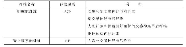 主要的外周神经递质有乙酰胆碱(acetylcholine,ACh)和去甲肾上腺素(noradrenaline,NE)。在神经生理学中,常以神经末梢释放的神经递质类型来命名和分类神经纤维。凡神经末梢释放乙酰胆碱作为递质的神经纤维,称为胆碱能纤维。凡神经末梢释放去甲肾上腺素作为递质的神经纤维称为肾上腺素能纤维。胆碱能纤维和肾上腺素能纤维在周围神经系统中的分布情况见表10-2。