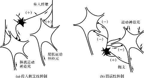 (1)传入侧支性抑制:传入侧支性抑制是指感觉传入神经纤维进入脊髓后,一方面直接兴奋某一中枢的神经元,另一方面发出其侧支兴奋另一抑制性中间神经元,然后通过抑制性中间神经元的活动转而抑制另一中枢的神经元。例如,引起屈肌反射的肌梭传入纤维进入脊髓后,直接兴奋屈肌运动神经元,引起屈肌收缩,同时发出侧支兴奋一个抑制性中间神经元,转而抑制伸肌运动神经元,导致伸肌舒张,以完成屈肌反射(图10-7(a))。这种抑制曾被称为交互抑制,其意义是能使不同中枢之间的活动相互协调。